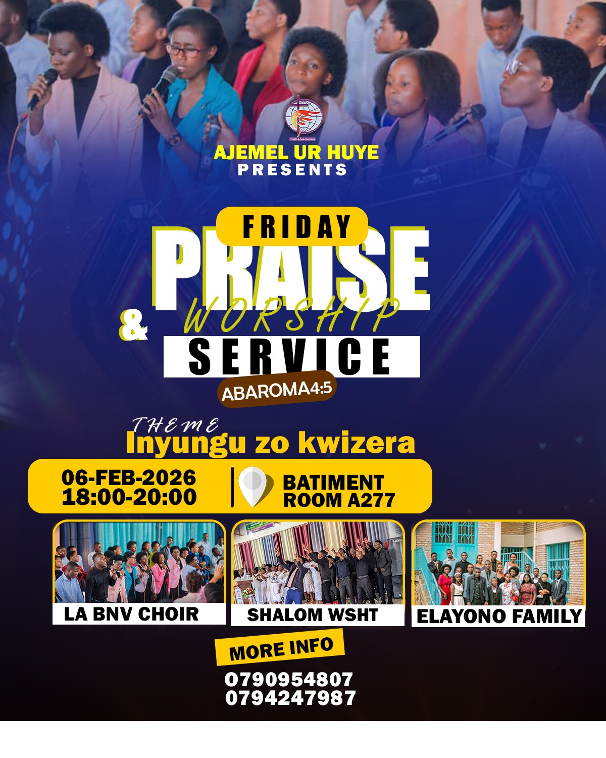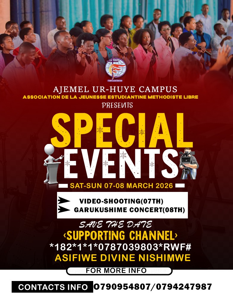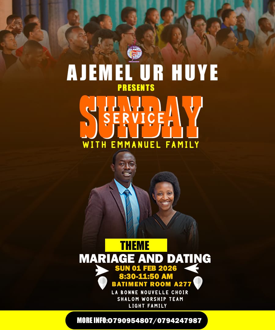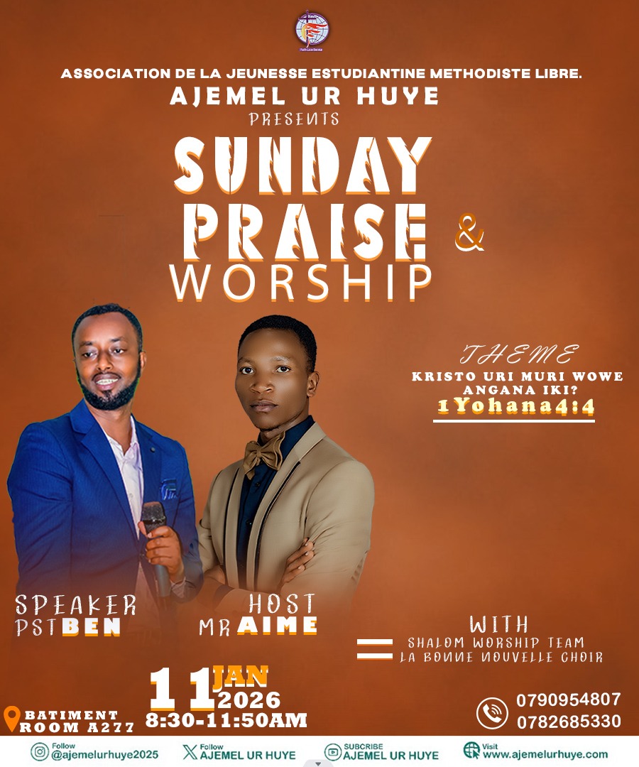 The Association de la Jeunesse Estudiantine Méthodiste Libre (AJEMEL UR Huye) joyfully invites students and the university community to a special Sunday Praise & Worship service, a time dedicated to lifting our hearts in worship and deepening our faith in Christ. The service will be held under the theme “Kristo uri muri wowe angana iki?” (1 Yohani 4:4), encouraging believers to reflect on the greatness of Christ who lives within them. This uplifting service will take place at Batiment, Room A277, on 11th January 2026, from 8:30 AM to 11:50 AM. The Word will be shared by Pst Ben, and the service will be hosted by Mr Aimé, alongside powerful praise and worship from Shalom Worship Team and La Bonne Nouvelle Choir. Everyone is warmly welcome to join this meaningful time of worship and fellowship.
